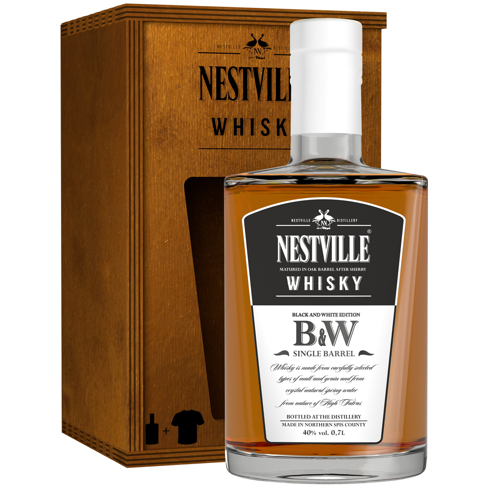 Nestville Whisky Black and White to specjalna edycja whisky z pojedynczą beczką. Pierwsze lata dojrzewają w beczkach po amerykańskim bourbonie, a ostatnie lata w beczkach po hiszpańskim winie po sherry. Stąd skrót B&W używany jako Bourbon & Wine (wino).