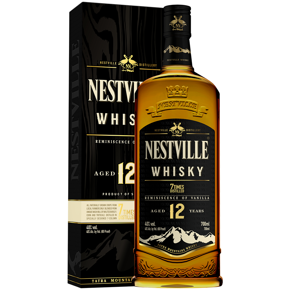 Proces produkcji naszej whisky jest starannie strzeżony, nie jest jednak żadną tajemnicą, dlaczego nasze 12-letnie Nestville Whisky Blended jest tak smaczne i delikatne. Krystalicznie czysta woda z Podtatrza, starannie wybrane gatunki zbóż i specjalnie zaprojektowana 7-kolumnowa destylacja to gwarancja zachowania delikatności smaku i zapachu. Maturacja whisky trwa od jednego do dwóch lat w nowych beczkach dębowych, aż do momentu pożądanego nasączenia gorzkimi tonami taninów, a następnie przesładniania do byłych beczek bourbon z Kentucky. Matowa nucie tego unikalnie zmieszanego 12-letniego whisky wychwala słodki wanilia, karmel i ton dębu.